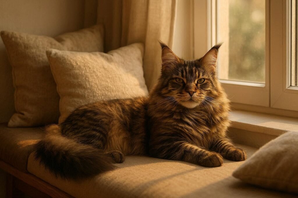 At home, Maine Coons enjoy curling up on soft cushions or playing with their favorite toys. Their playful yet laid-back temperament means you’ll often find them lounging by a sunny window or engaging in gentle wrestling matches with their humans.